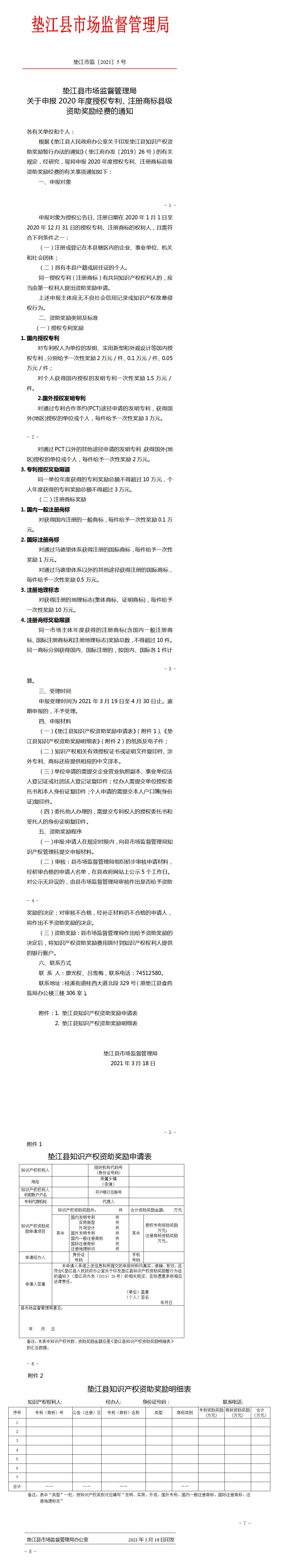垫江县市场监督管理局关于申报2020年度授权专利、注册商标县级资助奖励经费的通知